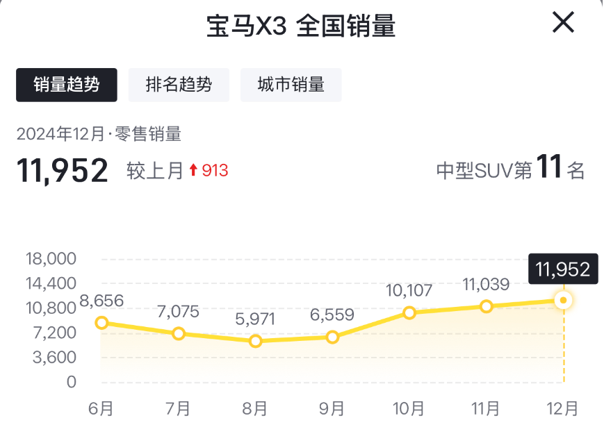 而从10月开始,宝马X3再次重回万辆以上,并且到12月的销量已经上涨到了近1.2万辆,此时全新一代宝马X3在国内已经发布,并宣布即将在2月份上市,而即将成为老款的X3,却实现了一波小高潮。